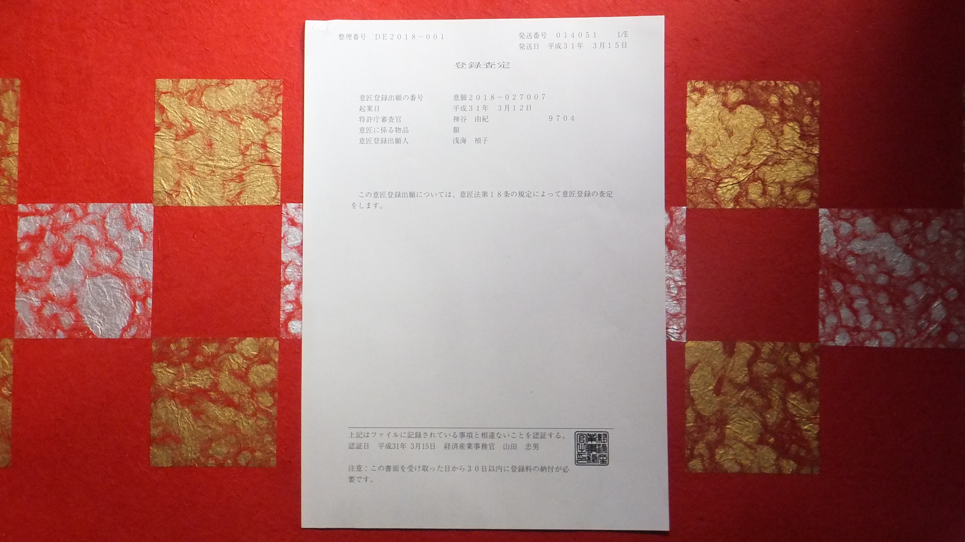 意匠登録査定書