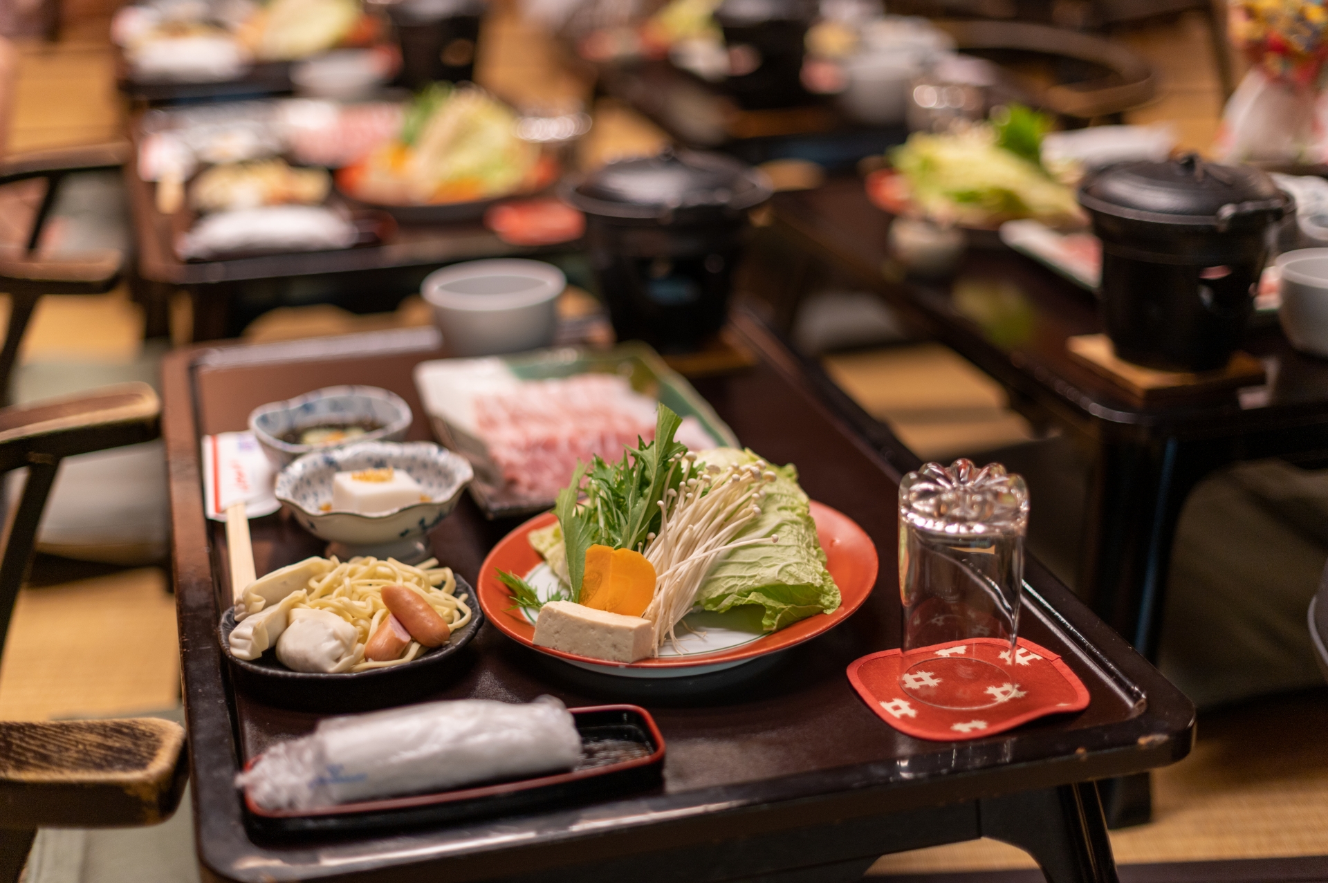 - テーブルは一辺1.5m程度で手を伸ばせば対面の参加者に届く程度の距離、隣席は肩がぶつかる程度の密接具合だった