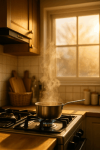 📸AI生成イメージ:冬の朝、鍋から湯気が立ちのぼる日本の台所