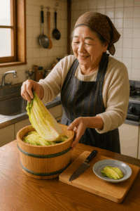 📸AI生成イメージ:漬物樽から白菜漬けを取り出すベテラン主婦
