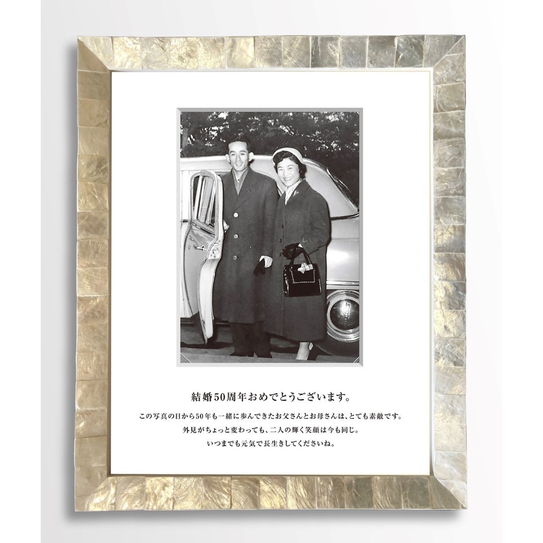 燻した金色がモダンで和テイストな額に、写真とインタビューで引き出したあなたの想いや記憶を文章にまとめ、素敵なデザインに仕上げる世界に1点だけのオリジナルで、特別な贈り物です。